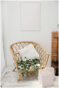 Minimalist setting with rattan chair, blank frame, and shopping bags.