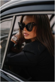 Chic woman sitting in a car, wearing sunglasses and looking over her shoulder with confidence.