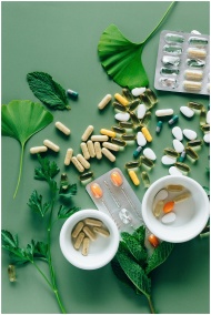 Flat lay of assorted pills and herbs on green surface, symbolizing health and wellness.