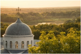 Dome of a church with a cross overlooks lush green valley and river during golden sunset.