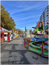 Colorful amusement park rides and food stalls under a bright blue sky.