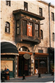 Rustic café facade with Ottoman architecture and Turkish flag in a historic street.