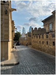 Cobblestone street in Baku, Azerbaijan with view of iconic Flame Towers.