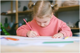 A young girl in a pink hoodie drawing with colored pencils at a table indoors.
