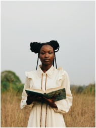 A serene portrait of a woman standing in a field holding a book, evoking a sense of calm and contemplation.