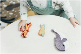A young child interacts with colorful wooden animal toys on a table, sparking creativity and play.