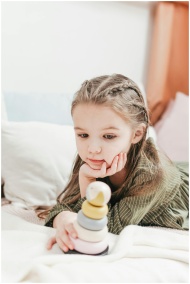 A young girl with braids playing with a colorful stacking toy indoors, focusing intently and showing curiosity.