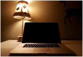 Warm light from a table lamp illuminating a laptop on a desk, creating a cozy workspace vibe.