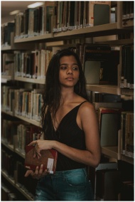 A woman stands in a library aisle, holding books and looking contemplative.
