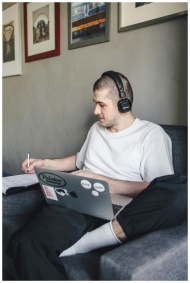 Adult man sitting on a couch, writing in a notebook while using a laptop, wearing headphones.