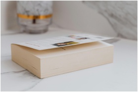 A minimalist close-up of a book placed on a marble surface with a soft focus in the background.
