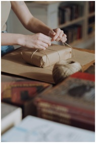Hands visible wrapping a book with craft paper and twine in a cozy bookstore environment.