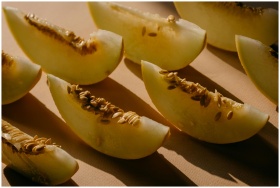 Close-up of honeydew melon slices with seeds under