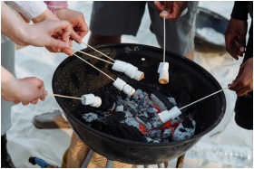 A group of people roasting marshmallows over a charcoal grill at the beach. Perfect summer activity.