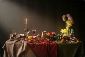Luxurious candlelit dinner table with fruits, red