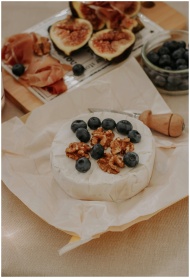 A gourmet arrangement of brie cheese topped with b