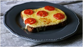 Delicious melted cheese and tomato toast on a rustic grey plate, perfect for breakfast or snack.
