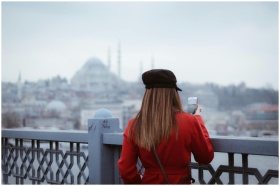 A tourist in a red coat takes a photo of Istanbul'