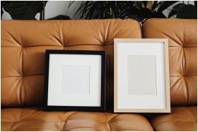 A cozy interior scene featuring black and wood picture frames on a brown leather sofa with indoor plants.