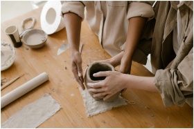 Close-up of hands crafting a pottery vase in an ar