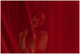 Artistic portrait of a woman with eyes closed surrounded by red curtains.