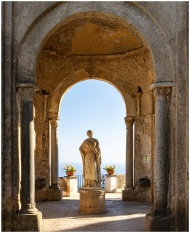 Elegant Roman statue under arches at Villa Cimbrone, Italy, overlooking the sea.