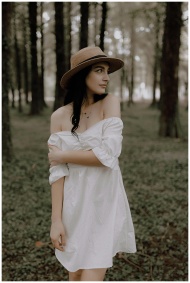 An elegant woman in a white dress and hat poses thoughtfully in a serene forest setting.