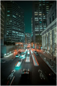 Long exposure of vibrant city traffic and skyscrap