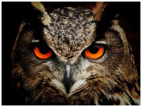 Intense close-up of an owl showcasing its vibrant orange eyes and detailed feathers.