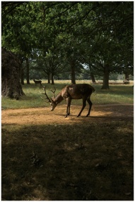 A serene photograph of a stag grazing in a sunlit forest clearing, showcasing wildlife in nature.