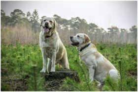 Two Labrador Retrievers enjoying a walk in a lush