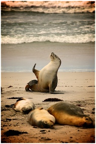 A group of sea lions relaxing on the sandy beach w