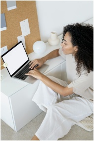 A focused woman with curly hair sitting indoors typing on a blank laptop screen.