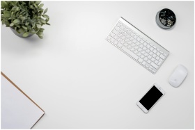 A neat and organized home office setup with a wireless keyboard, mouse, and smartphone.