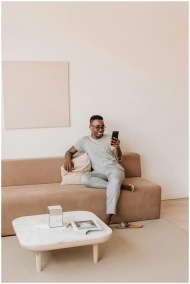 A man casually sits on a modern sofa using a smartphone, blending technology and relaxation.