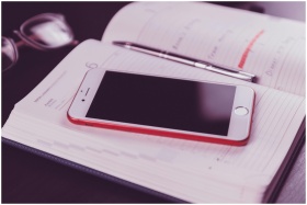 A red and white smartphone on an open diary accomp