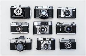 A flat lay of various vintage cameras showcasing classic photographic equipment.
