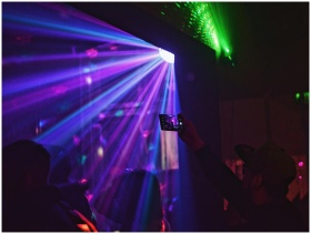 Silhouettes of people in light of disco ball dancing in nightclub and man in cap taking photo