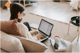 From above back view of full length female freelancer with crossed legs sitting on cozy sofa with cup of tea on book while typing text on laptop