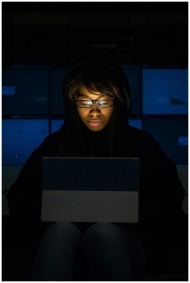 Woman immersed in laptop work during nighttime. Technology and focus in action.
