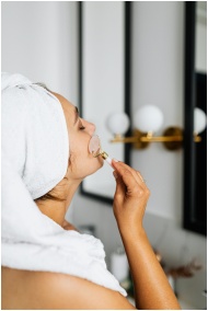 A woman using a face roller for a skincare routine
