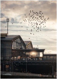 A dramatic view of Berlin's Friedrichstrasse Station at sunset with a flock of birds soaring in the sky.
