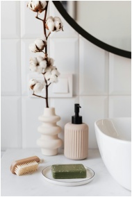 Stylish bathroom setup featuring green soap, cotto