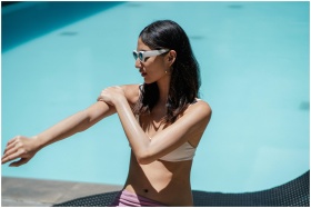 High angle of alluring young ethnic female tourist with long dark hair in stylish swimwear and sunglasses applying sunscreen cream while relaxing near outdoor swimming pool
