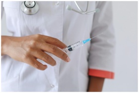 Close-up of a healthcare professional holding a syringe, ready for injection. Focus on hand and syringe.