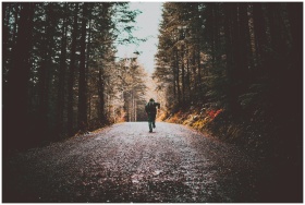 A lone traveler runs down a scenic forest dirt road, surrounded by tall trees.