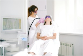 Aesthetician performing laser facial treatment on woman with protective eyewear in a modern clinic.