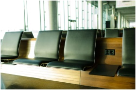 Empty airport seating area with sunlight streaming in, creating a tranquil atmosphere.
