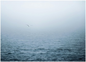 A solitary seagull glides over fog-covered waters