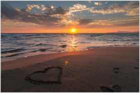 Beautiful sunset over ocean with a heart shape in the sand, perfect for romantic themes.